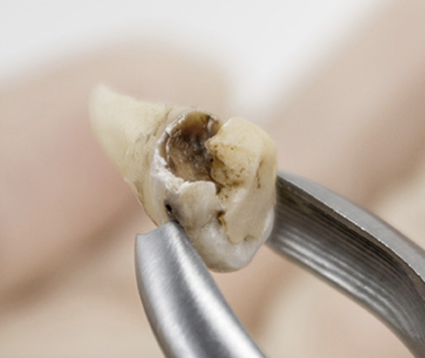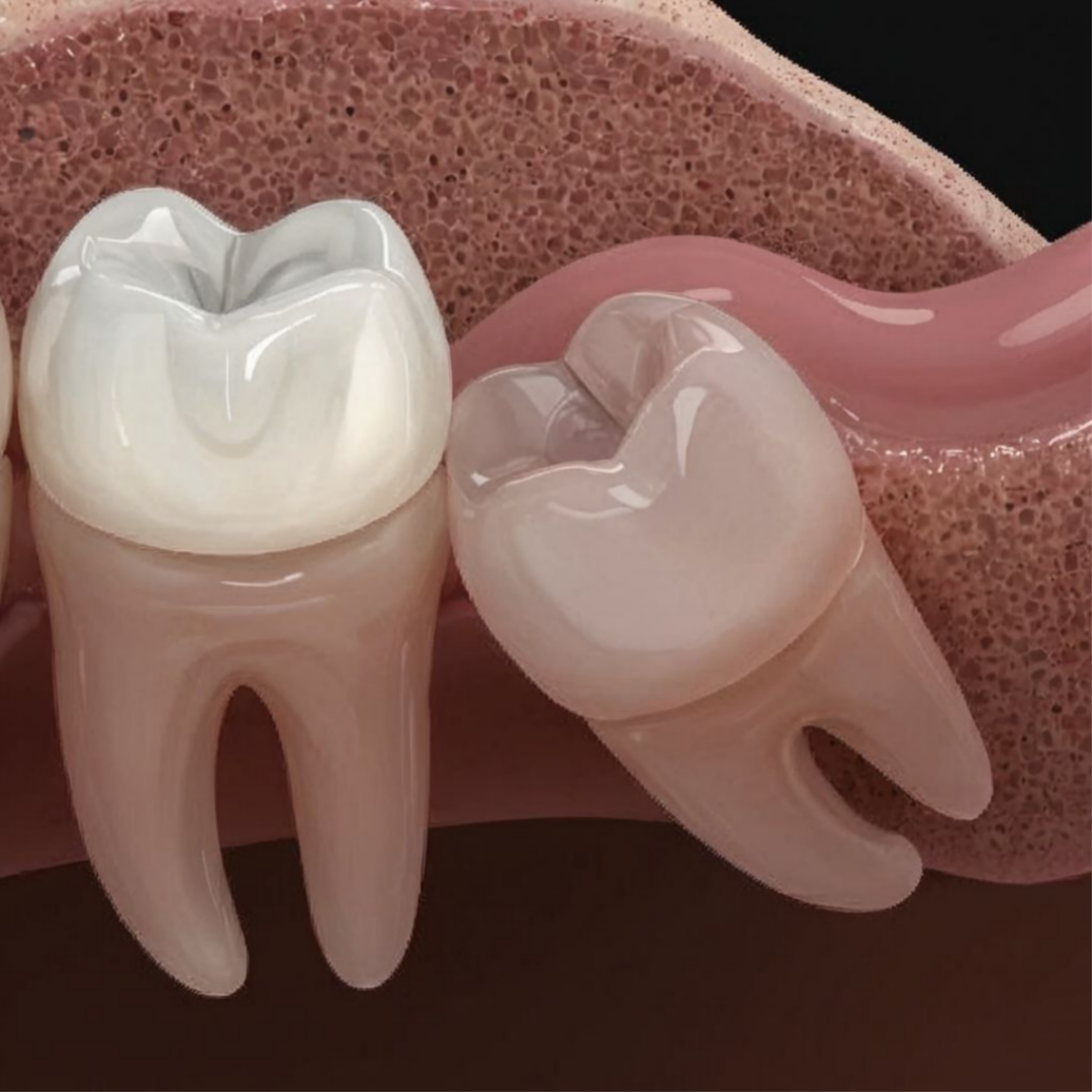 주변 치아를 밀어내어 치열이 삐뚤어지는 부정교합을 유발합니다.