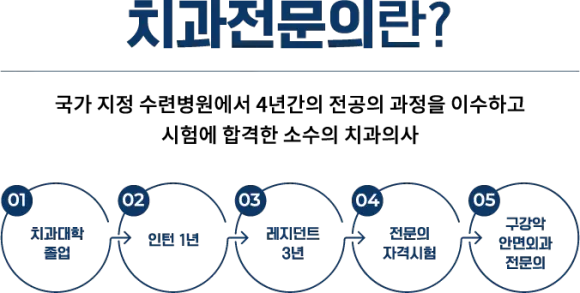 치과전문의는 국가 지정 수련병원에서 4년간의 전공의 과정을 이수하고 시험에 합격한 소수의 치과의사를 말합니다.