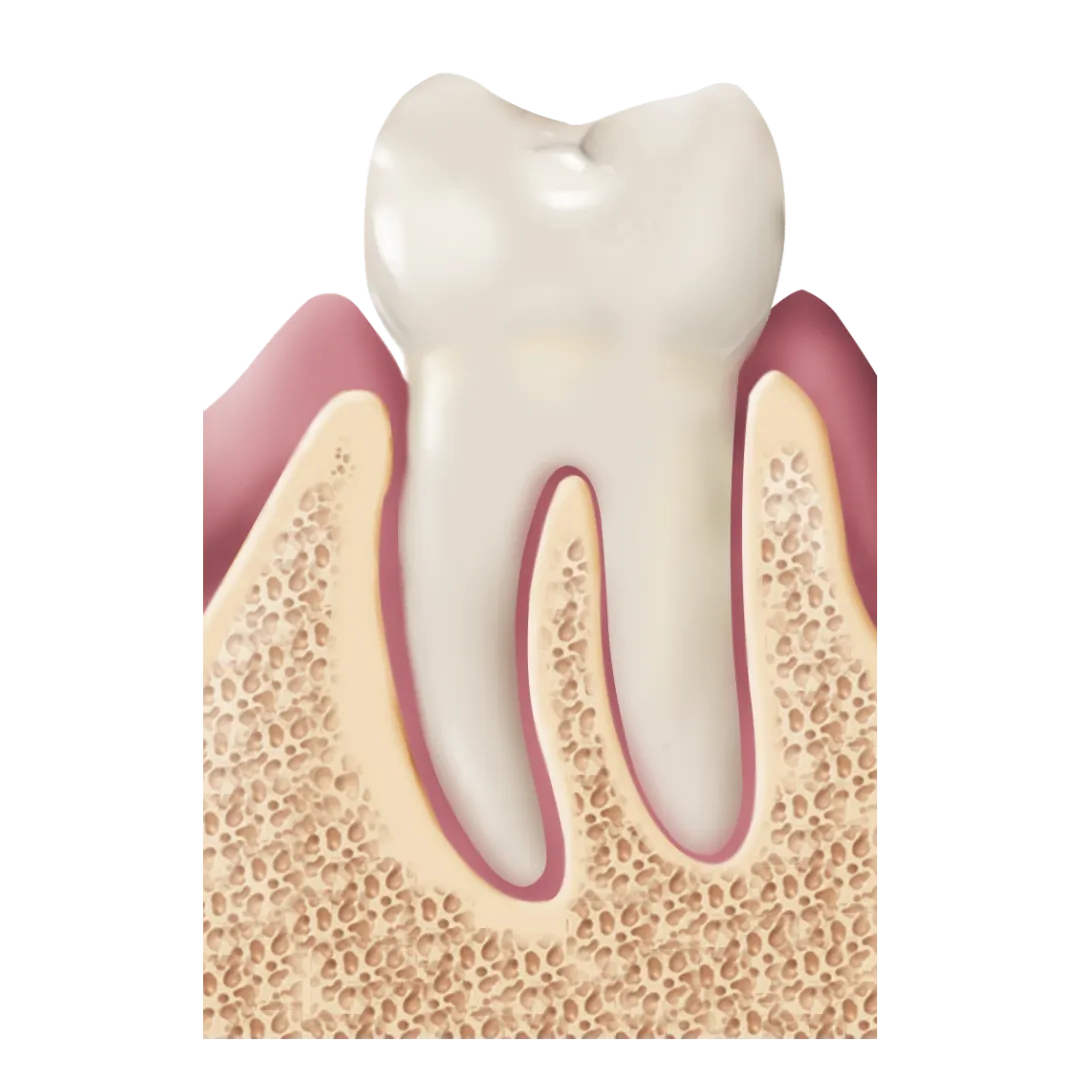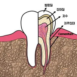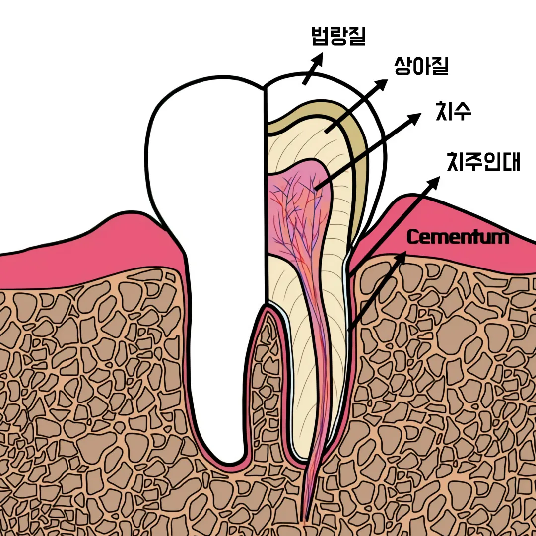치주인대는 치아와 치조골(잇몸뼈) 사이에 위치하는 얇은 막으로서, 치아에 가해지는 무게나 충격을 완화하는 일종의 쿠션 역할을 합니다.