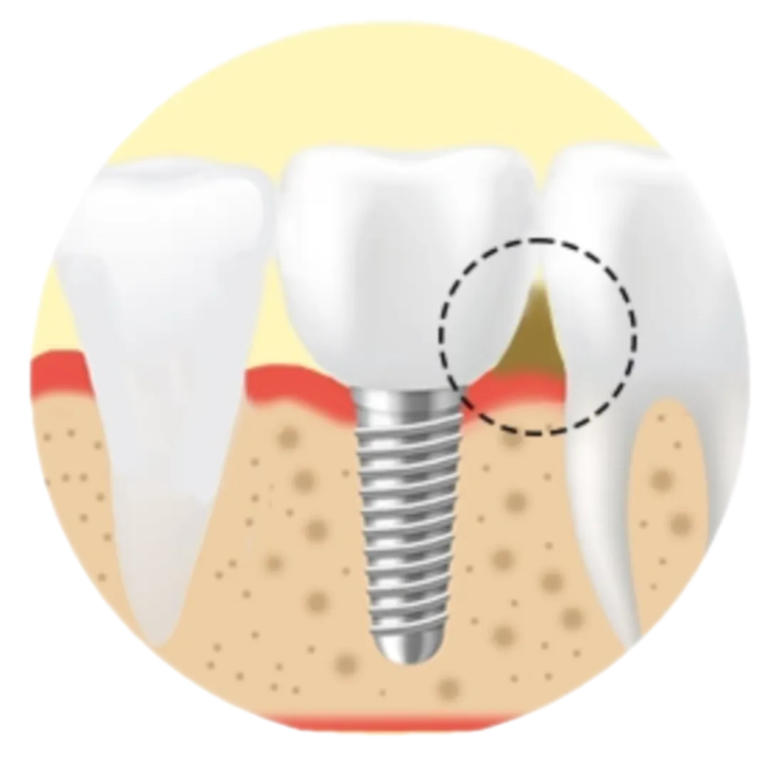 반면, 임플란트는 자연치아에 비해 뿌리에 해당하는 부분의 직경이 작기 때문에 치아 사이 간격이 넓어져서 음식물이 쉽게 끼이게 됩니다.