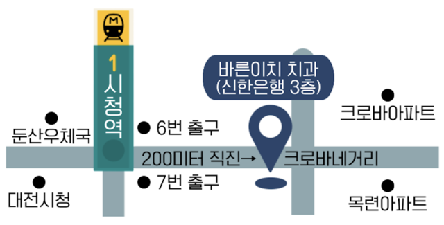 시청역 6,7번 출구(에스컬레이터 6번 출구)로 올라오신 후 직진으로 조금만 걸으시면(200미터) 신한은행 건물 3층에 치과가 있습니다.